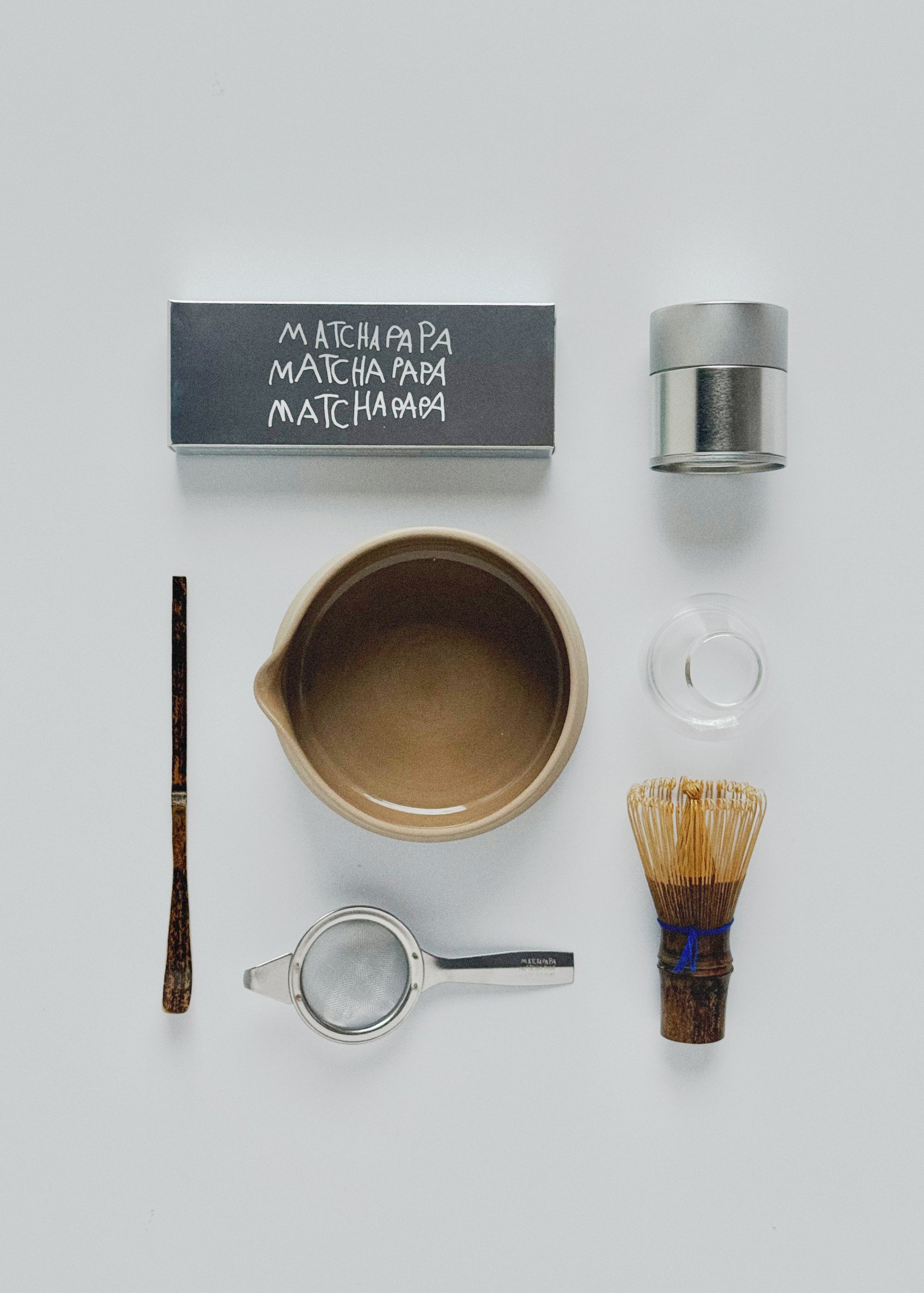Our authentic matcha ceremony set includes a handcrafted chawan (tea bowl), chasen (bamboo whisk with 80-120 tines), chashaku (bamboo scoop), kusenaoshi (whisk holder), sifter for perfect powder consistency, and detailed preparation guide. Each component is selected for quality and traditional authenticity.