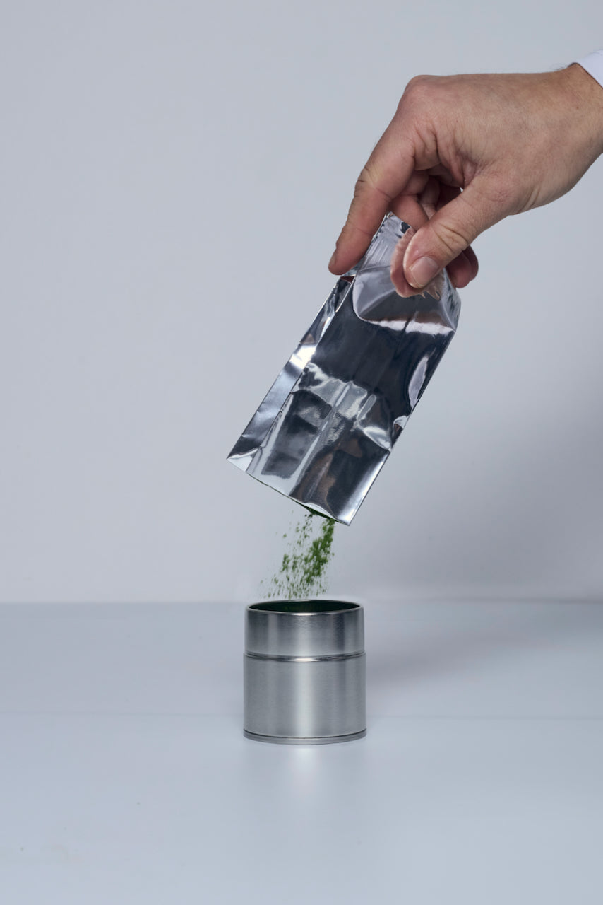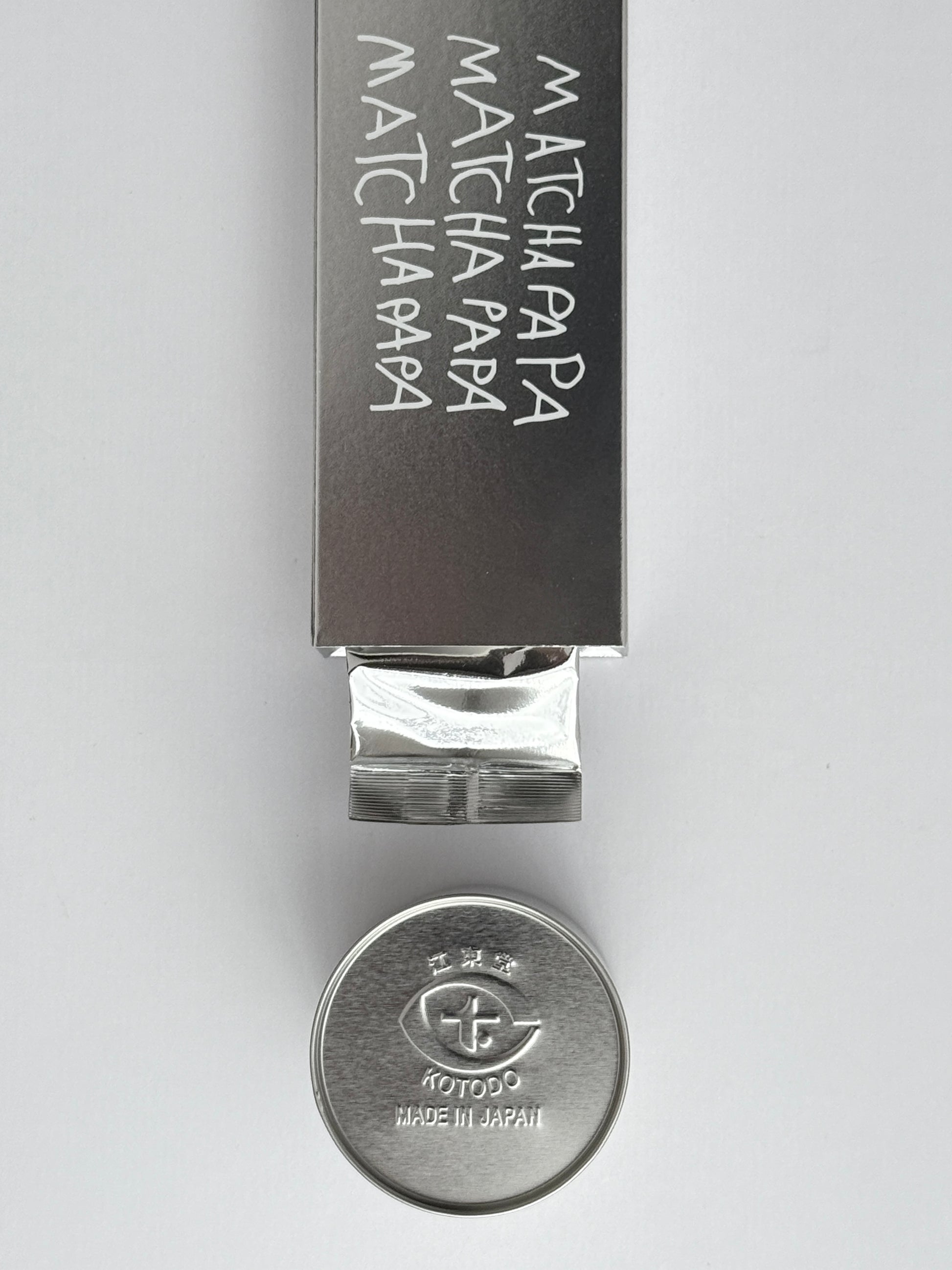 Includes one silver tea canister (chazutsu), handcrafted in Tokyo, and a 30g matcha of your choice.